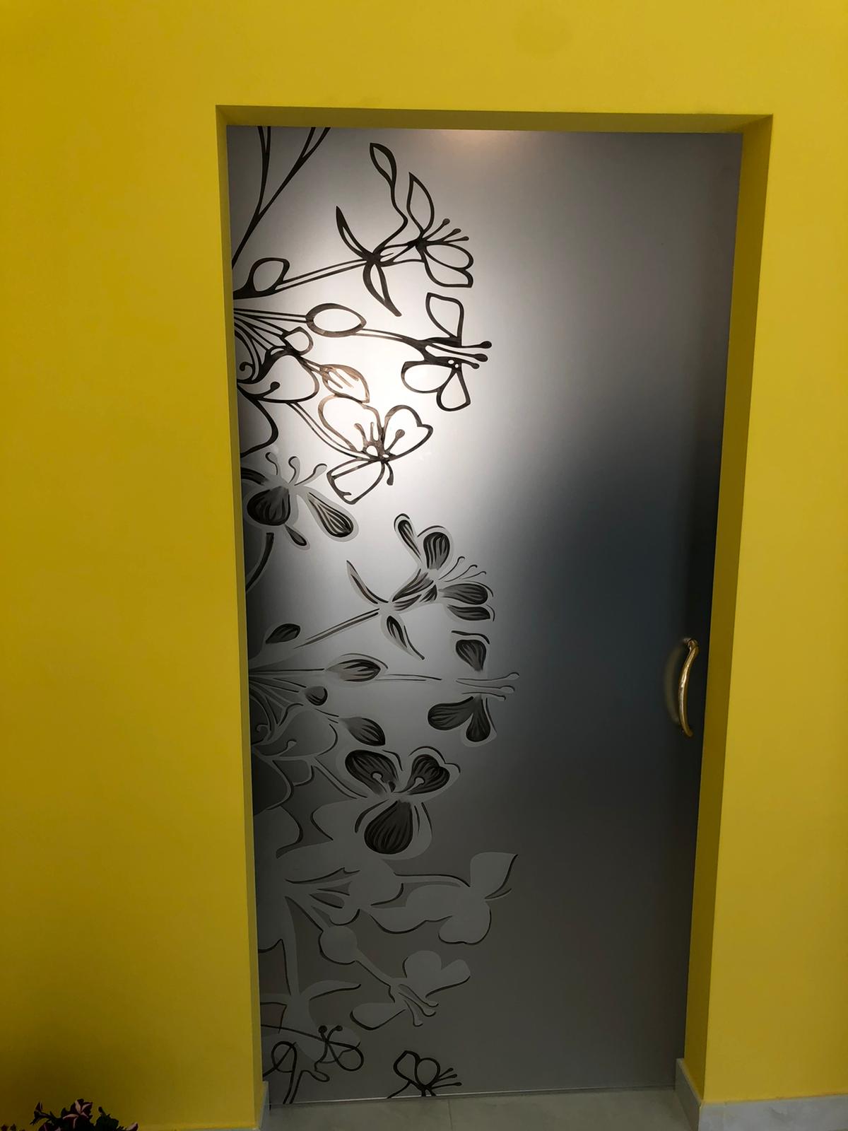 I disegni delle vetrate artistiche possono essere realizzati in in versione sabbiata, colorata, con effetto lucido o trasparente su vetri opachi.